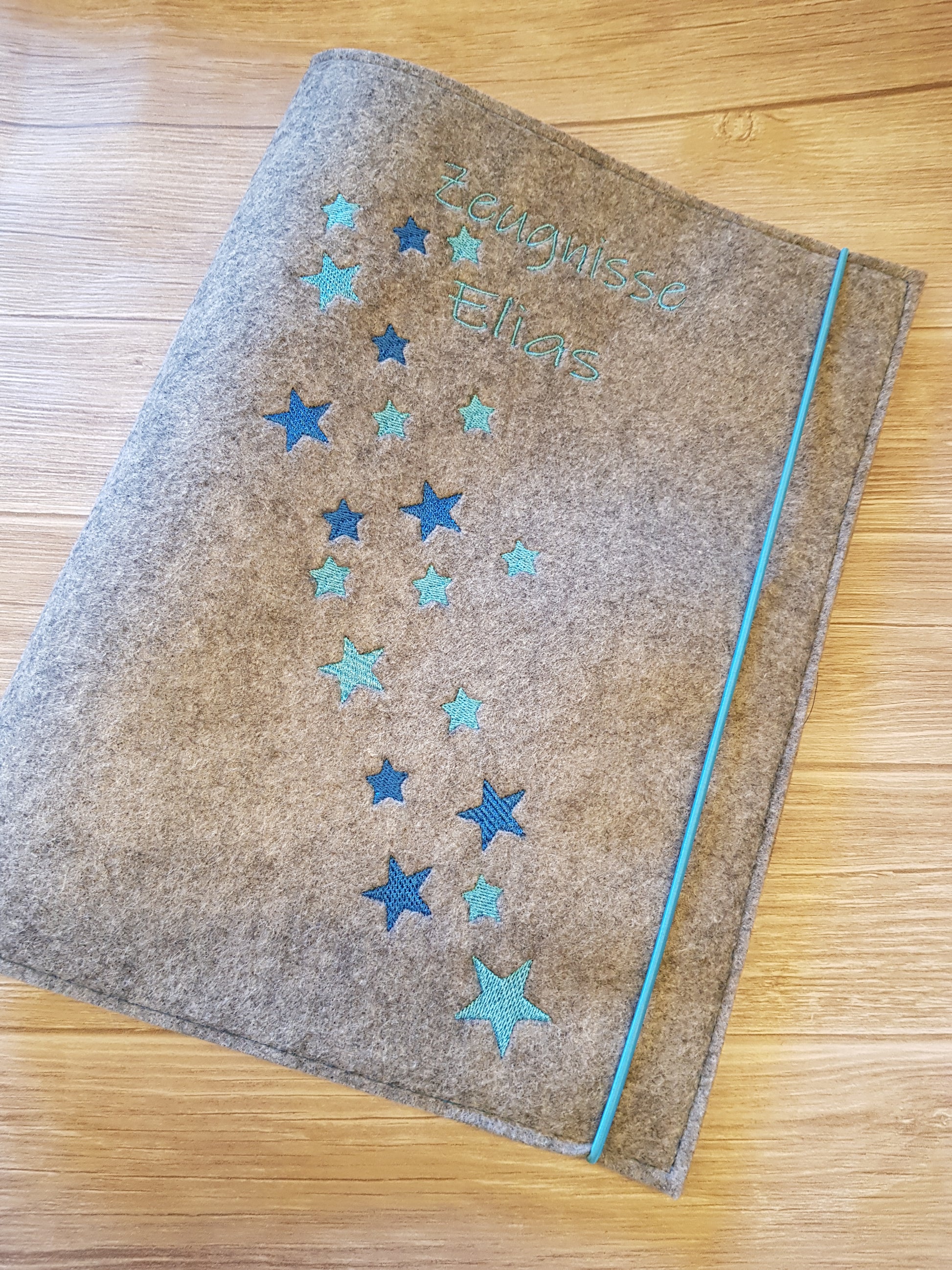 Ich habe eine Zeugnismappe aus hellgrauen Filz genäht. Sie wird mit unterschiedlichfarbigen Sternen und dem Wunschnamen des Kindes bestickt. Innen befindet sich eine Mappe mit 20 Klarsichthüllen. Geschlossen wird sie mit einem Gummiband.