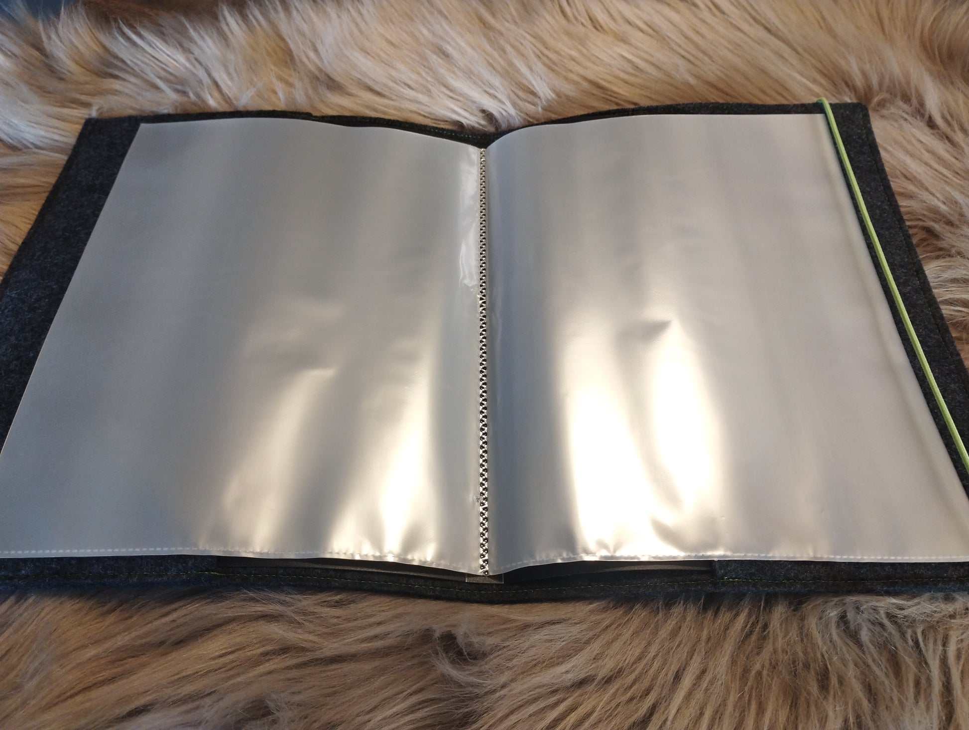 Ich habe aus dunkelgrauen Filz eine Zeugnismappe genäht. Die Vorderseite ist mit einem Fußball und dem Wunschnamen des Kindes bestickt worden. Innen befindet sich eine Mappe mit 20 Klarsichthüllen. Geschlossen wird sie mit einem Gummiband.